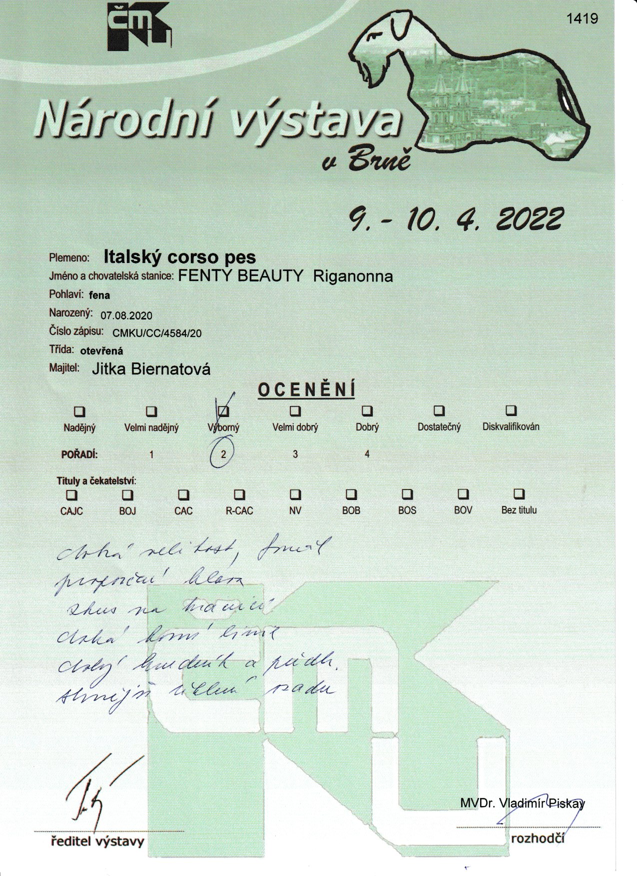 Zde se panu rozhodčímu MVDr. Piskayovi líbila, a dostala hodnocení Výborná